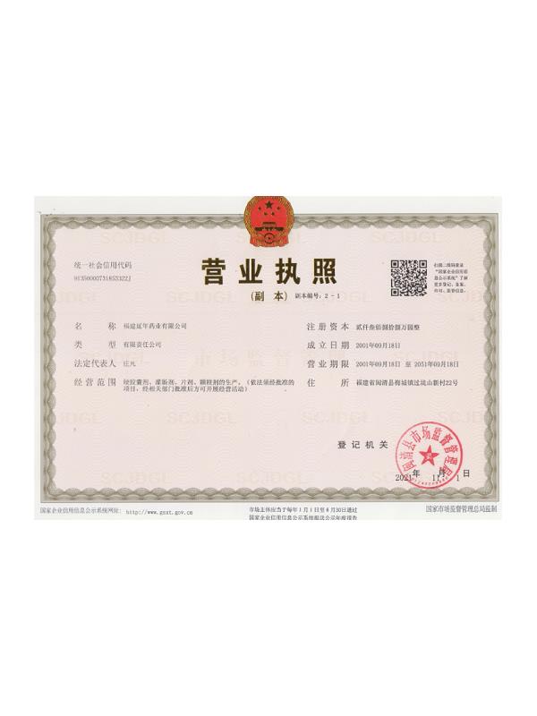 福建延年藥業有限公司位于福州市閩清縣城關,工廠坐落在風景秀美的梅城森林公園山腳下,公司前身是中國人民解放軍第9747工廠,創辦于1970年9月,隸屬南京軍區總后勤部,企業的地方名稱為福建閩清制藥廠。1998年6月為貫徹中央關于軍隊不再從事經商活動的決議,企業軍轉地改制移交地方,2001年9月企業改制,更名為福建延年藥業有限公司。